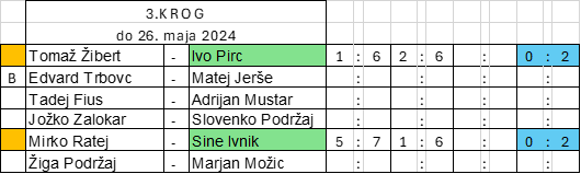 Vreme nam tudi v prihajajočem tednu ne bo naklonjeno. V kolikor se bo le izboljšalo imejte v mislih dvoboje, ki niso bili odigrani v preteklih krogih in odigrajte najprej te.