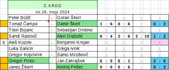 V tretjem tednu nas je zopet spremljalo slabo vreme in obvestila o poškodbah. Kljub temu je bilo do 26. maja odigrano vsaj nekaj dvobojev drugega in tretjega kroga v obeh ligah.