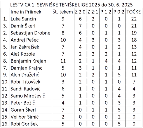 Z 29. junijem naj bi končali tekme vse do sedmega kroga. Ure primerne za igranje tenisa so se premaknile v zgodnje dopoldne in pozno popoldne. Veseli me, da nihče ne preizkuša skrajnih meja svojega telesa. Sedmi, četrti in šesti krog v prvi ligi ima najmanj odigranih tekem. Izstopa prav sedmi z le dvema odigranima tekmama. Pogled na razpored, dogovor preko klica in akcija je recept za uspešno nadaljevanje lige. Trenutna lestvica v prvi ligi izgleda takole: