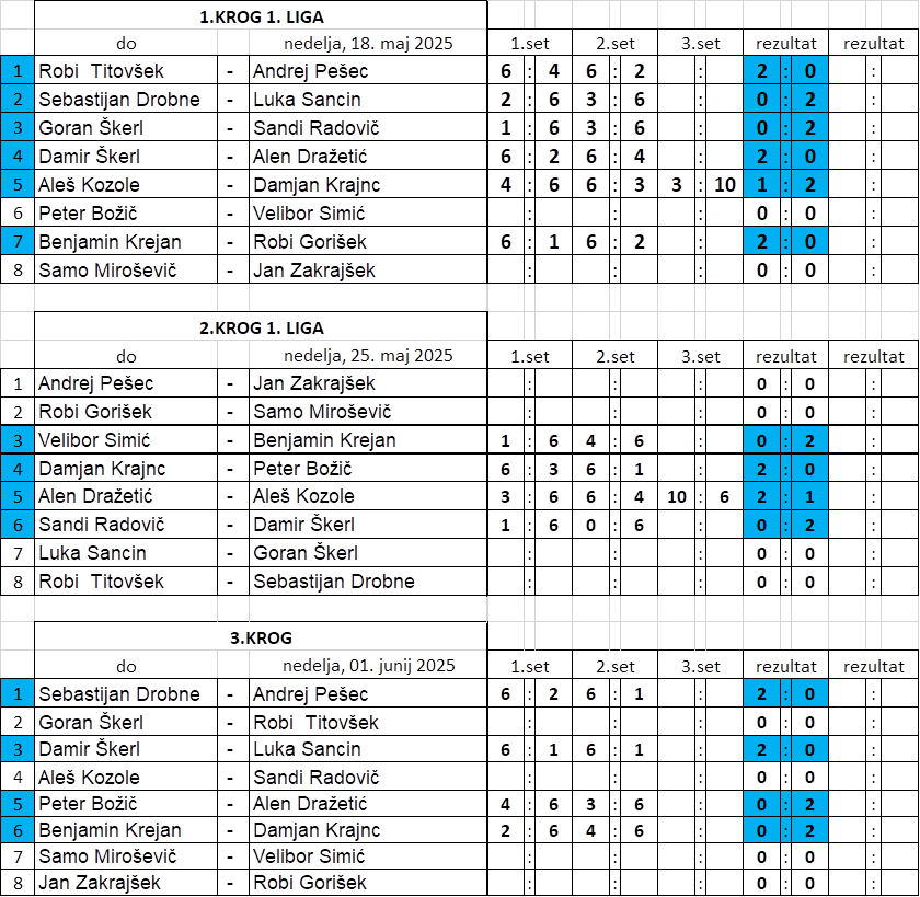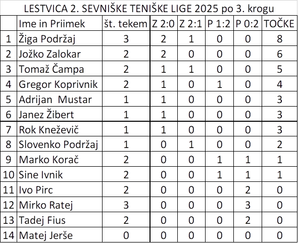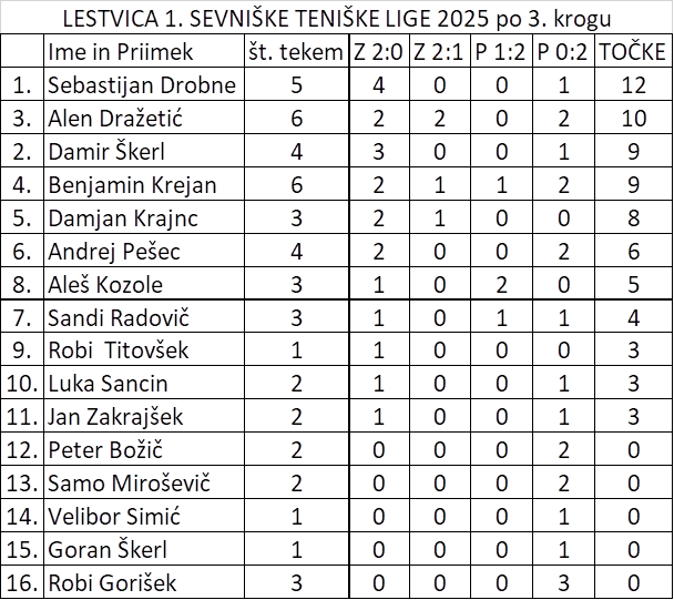 Po končanem tretjem tednu ugotavljam, da je tempo odigranih tekem stagniral, igralci na skrivaj trenirajo svoja šibka področja in čakajo prihod optimalne forme. Kljub temu je bilo odigranih nekaj tekem, ne samo za tekoči teden, ampak tudi kola v naprej. Pohvalno. Danes prilagam tudi trenutno stanje na lestvici obeh lig posameznikov.
