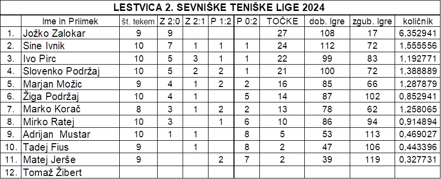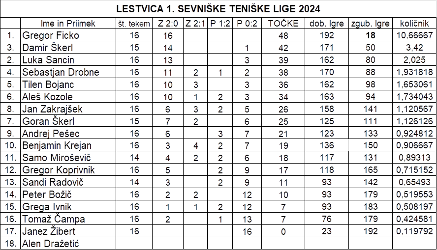 V soboto, 19. 10. 2024, smo z zadnjo odigrano tekmo zaključili sevniško teniško ligo 2024. V nadaljevanju sledi končna lestvica in razvrstitev v obeh ligah. Še prej pa najavljam turnir dvojic, ki se bo izvedel v soboto, 26. 10. 2024, s pričetkom ob 9.00 na domačih teniških igriščih. Pare bomo žrebali v prvih dveh kolih, nato pa po prirejenem #šampanc sistemu# (imenovanem velika kuhna) do odigranih štirih ali petih kol do iger na izločanje do končnih zmagovalcev. Nekje vmes ali proti koncu turnirja bomo podelili tudi obljubljene nagrade najboljšim v obeh teniških ligah. Prijave so zelo zaželene in jih zbiram do petka 25. oktobra.